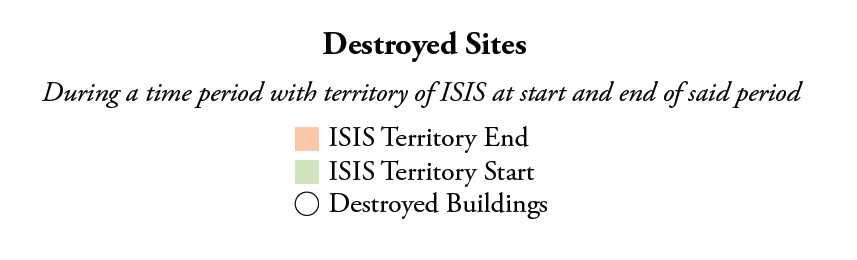 The following images detail a six week investigation into the destruction of Mosul during the Battle of Mosul between ISIS and Iraqi and US Coalition Forces in 2016-2017. The process starts looking broadly at the city itself, the destruction and damage inflicted on the city and its people, identifying individual building programmatic losses of schools and cultural institutions. It then draws the lines of territory shrinking over time, matching this data with the destruction of buildings identifying correlations and anomalies.